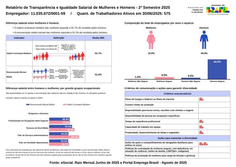 É imprescindível reforçar que a Agro Serra não adota qualquer prática discriminatória em relação à remuneração entre homens e mulheres. As diferenças apontadas pelo relatório decorrem das especificidades das funções, da distribuição de cargos e das características da atividade agrícola, não de desigualdade ou injustiça salarial.